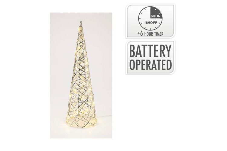Timer Cone Tree With Led Iron Size: 12X12X40Cm With Pet Strip In Silver Colour 20X Ww Micro Led Transparent Lead Wire 30Cm Bulb Distance 10Cm Ip20 Battery Operated 2X Aa Batteries Not Included With 6/18 Timer