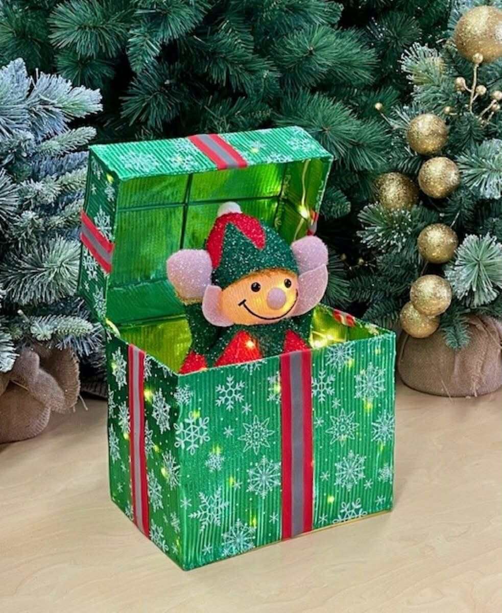 Add some fun and movement to any Christmas display with this cute Elf. The lid of this green, decorated gift box opens and an adorable elf pops up to say a festive hello. It also comes complete with LED lights and can be used indoors or outdoors but need to be under cover.