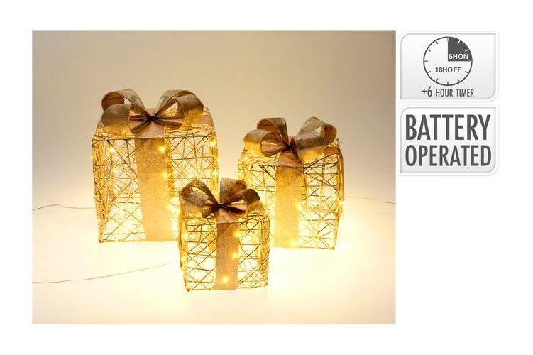 Timer Giftbox Set Square With Led Iron 3 Sizes: Small (20X Ww Led 2X Aa) Medium (30X Ww Led 3X Aa) Large (40X Ww Led 3X Aa) With Pet Strip In Champagne Gold Colour Transparent Lead Wire 30Cm Bulb Distance 10Cm Ip20 Battery Operated Batteries Not Included With 6/18 Timer