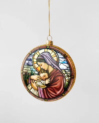 Recall the stories of Bethlehem and the birth of Jesus with this beautiful ornament. Painted in the style of a church stained glass window, this glass disc ornament depicts baby Jesus in the arms of Mary whilst the reverse side of the ornament decorated with sweet floral patterns. Jewel tones of burgundy, purple and gold feature. This piece makes a beautiful tree decoration or a special gift for a loved one.