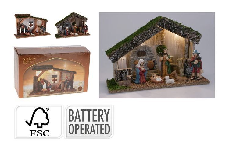 Mdf House With 7 Nativity Figures With 5Led Warm White Mdf/Cedarwood/Polyresin Size: 30X11X18Cm Weight: 830Gram 2Ass Designs B/O 2X Aa Batteries Nog Included Each With Colorbox Item Fsc Certified