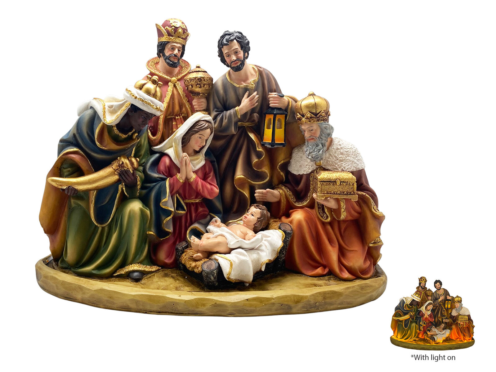 A beautiful all-in-one resin nativity with lights that is compact and measures 320mm in height. Takes 2 x AAA batteries (not included).